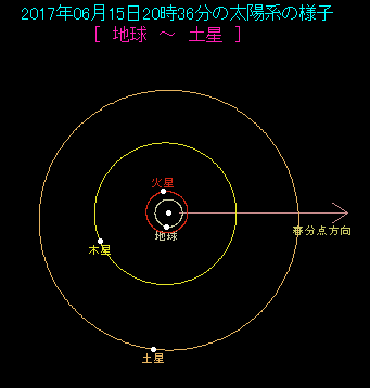 6月15日に土星が衝となります。衝とは惑星が太陽から180度離れた位置にやってくることです。下に示した太陽系の図をご覧ください。太陽、地球、土星がこの順に一直線に並んでいます。地球から見た土星は太陽とちょうど反対側にあり、衝であることがわかります。
