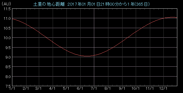 次に、土星の地心距離のグラフを見てみましょう。6月中旬に最も小さな値を示しています。土星は地球に近づいていますので、天体観測に適しています。
