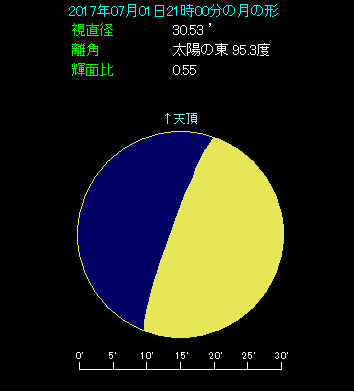 7月1日は月と木星が接近します。下の星図は21時ごろ、東京から南西方向の夜空を見上げたものです。空の中ほどよりも低い位置に、月齢7.4という上弦の月があります。そのすぐ下、2.2度離れたところに金色で光る木星があって、間隔が狭い良い条件の接近です。 最近、両天体の接近は間隔が広いことが多かったので、今回の接近を見逃さないようにしてください。なお、今月末にも再び近づきますが、こちらは条件があまり良くありません。