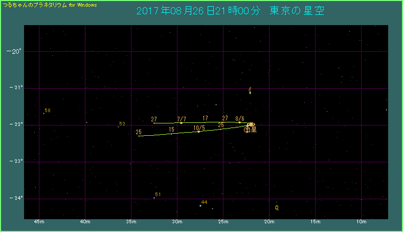 拡大した土星の経路図をご覧ください。6月15日に衝となった頃、公転軌道上で動きが速い地球が動きの遅い土星を追い越しました。このため星図上では後戻りするように、左から右へ動いていました。これを逆行といいます。しかし、地球が土星を追い越すイベントも終わり、土星は動く向きを変えて逆行から順行に転じます。このとき土星はいったん動きを止めるように見え、留と呼んでいます。