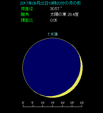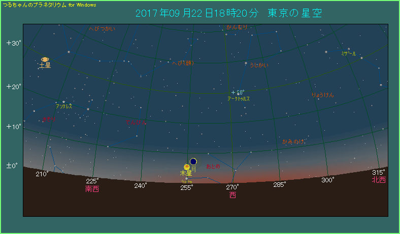 9月22日は月と木星が接近します。接近間隔は2.9度ですから条件はまずまず良いものです。しかし、木星は10月27日に合をひかえており、日没後の高度が低くて見づらいでしょう。 下の星図は9月22日の日没からおよそ40分後のようすです。薄明が強く残っている上に木星の高度も5度あまりしかありません。月齢は2.2で、非常に細い月です。