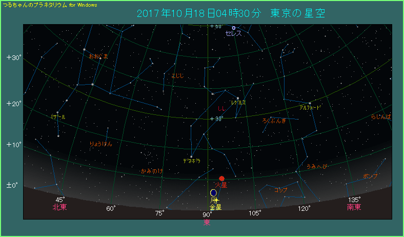 これだけでも見ごたえがあるのですが、さらに月から右上へ5.6度離れたところに火星があります。しかし明るさは1.8等しかなく、火星としては冴えないものです。月と金星と火星という三つの天体が集まるこの日を見逃さないようにしてください。
