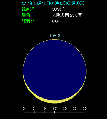 下の星図は東京で日の出から1時間20分前、空が明るくなり始める頃に見た東天のようすです。低い位置にピカーッと光る金星があります。しかし高度が3.3度しかありません。金星から上方へ2.7度離れた所に月があります。月齢は27.6で、2日後に新月を控えた非常に細い月です。