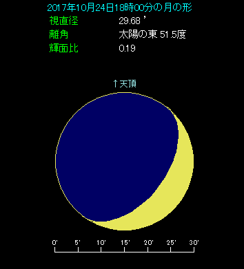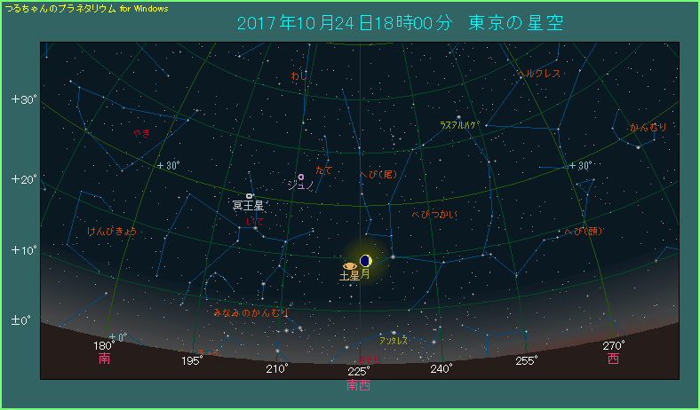 下の星図は18時ごろ、東京から南西方向を見たようすです。まだ少し薄明が残っている状態で、あと20分したら空が完全に暗くなります。比較的低い位置に、月齢4.6の月が見えます。土星はその左側、3.2度離れたところにあります。土星の高度が下がってきましたので、南西方向が開けた場所からご覧になってください。