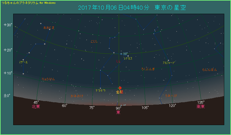 下の星図は10月6日の4時40分ごろに真東方向を眺めたようすです。低空に金星と火星がピッタリくっついています。拡大図を見ると左側に金星、右側に火星があって、横方向に並んでいることがわかります。