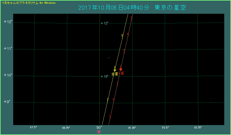 当日ご覧になれない方のための情報です。前日なら34分、翌日なら43分の間隔ですが、それでも1度を切る大接近です。10月6日が見られない方もあきらめないで、前日か翌日にご覧になってください。その場合、金星から見た火星の位置は、前日なら下方向で、翌日なら右上方向になります。位置関係に注意しましょう。