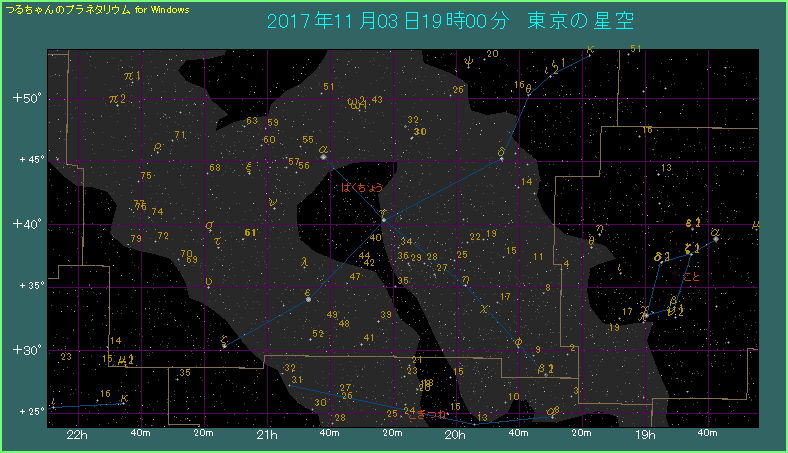 なお、この時期のはくちょう座は、意外と高い位置に見えます。21時ごろなら西北西の空の中ほどにあって、首が痛くならずにすみます。