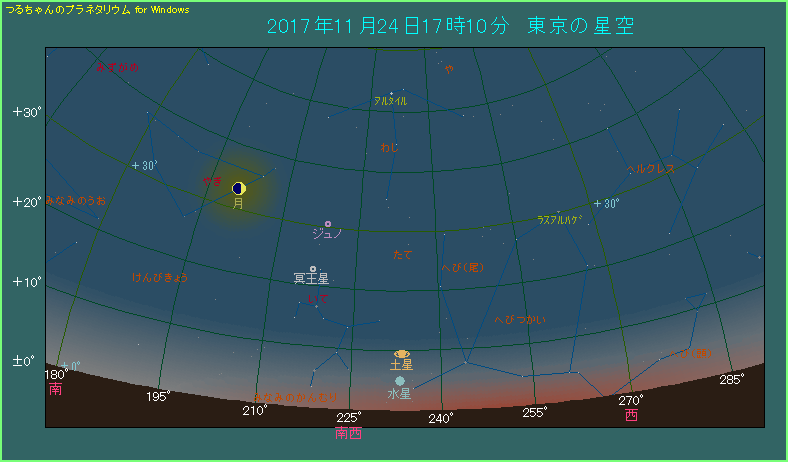 下の星図は11月24日の17時10分ごろ、東京から南西方向を眺めたようすです。今回見られるのは西ではなく、南西になりますので注意してください。この時刻は日の入りから40分しかたっておらず、空が完全に暗くなるのに、あと50分ほどかかります。空はまだ薄明状態ですし、水星の高度も5度しかありません。水星の明るさが-0.3等とはいえ、肉眼で探すのは意外と骨が折れます。