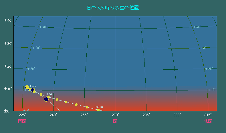 日の入り時刻における水星の位置変化 |
