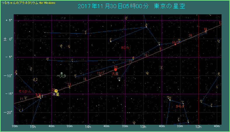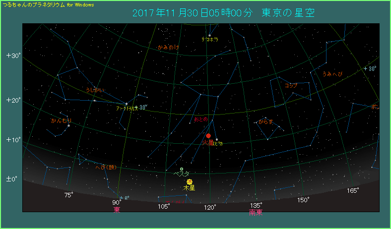 下の星図は朝の5時ごろ、東から南東方向の空を描いたものです。赤い火星と青白い色をしたスピカが、3.1度の間隔で斜めに並んでいます。明るさはスピカが1.0等なのに対して火星は1.7等と少しさえません。はるか下方には金色に光る木星もありますので、いっしょに見ておかれるとよいでしょう。