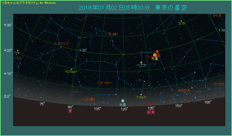 下の星図は朝の5時半ごろ、南東の方角を眺めたようすです。この日、東京での日の出は6時51分なので、日の出からおよそ1時間20分前のようすです。空は5時20分から明るくなり始めますが、まだ暗夜に近い状態です。
