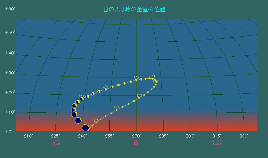 今年の金星は10月ごろまで、宵の明星として夕方の西空で輝きます。しかし上図のように、日没時点の高度があまり高くなりません。せいぜい30度止まりですから人目につきにくく、今ひとつパッとしない金星になりそうです。