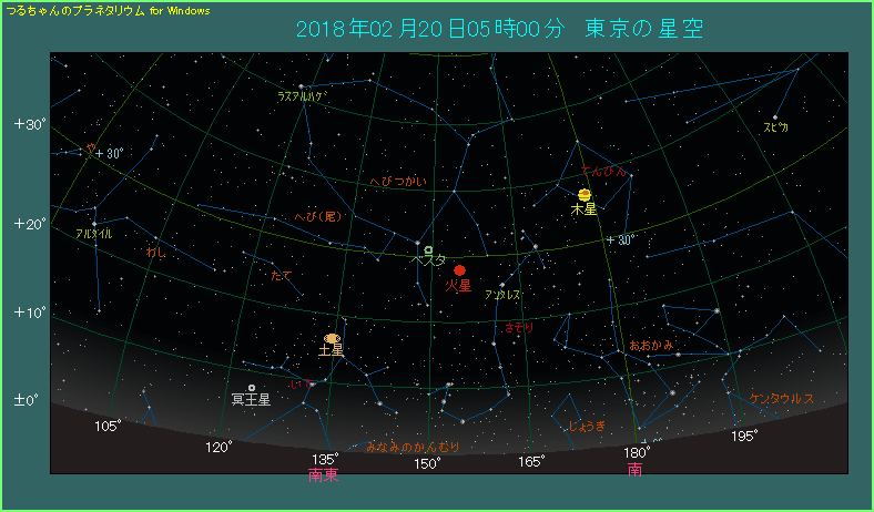 夜明け前の5時ごろ、南東から南の方向を見てみましょう。南東の低い位置から右上方向へ目を移すと、土星、火星、木星の順に、三個の惑星を見ることができます。