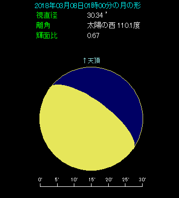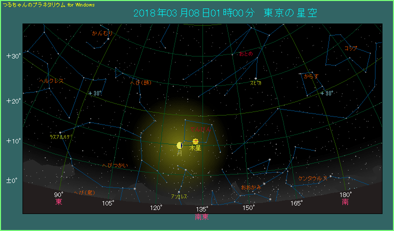 3月7日の深夜、月と木星が近づきます。 下の星図は日が変わった8日、1時ごろのようすです。南東の空に月齢19.8という丸みを帯びた月があります。星座でいえばてんびん座です。その右側へ5.5度離れたところに木星があります。