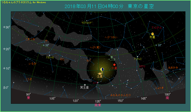 昨日は月と火星が並びましたが、今日は月と土星が並びます。 朝の4時ごろ、南東の低い位置に月が見えます。昨日よりも一つ月齢が上がって22.9となり、半月よりも少しだけ欠けています。土星は月の左下にあります。間隔は4.2度ですから、それほど接近しているわけではありません。