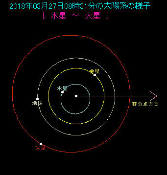 西矩とは、地球から見た惑星が太陽の西側へ90度離れることです。太陽系の図を見ると、太陽、地球、火星の作る角度が90度になっています。西矩の頃の惑星は、深夜に東から昇ってきて、日の出の頃に南中します。