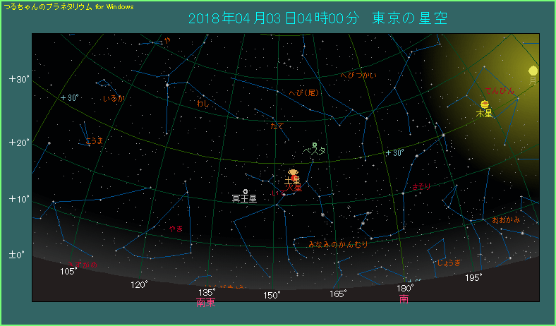 接近の間隔は朝4時の場合、4月2日だと1.3度です。4月3日も同じ1.3度ですが、4月3日の方が3分角(=0.05度)だけ近くなります。