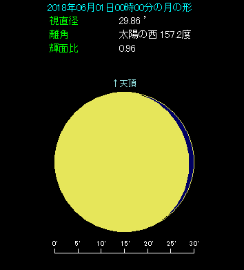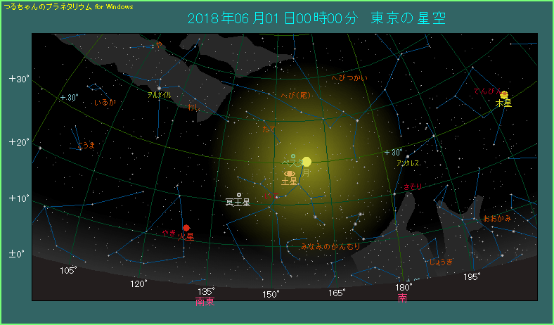 5月31日の深夜から6月1日の早朝にかけて、月と土星が並びます。 下の星図は6月1日に日が替わった頃、南南東の空のようすです。月齢16.1という満月を過ぎた大きな月があります。その左下へ4.9度離れたところに土星があります。