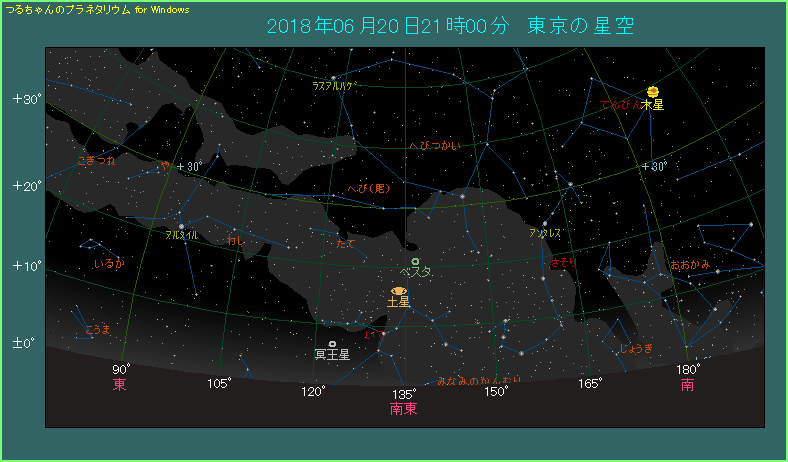21時ごろに南東の空をご覧ください。低い位置に土星があり、ベスタは土星の右上にあります。今回の衝は非常に条件が良く、5.3等まで明るくなっています。といっても5等台です。市街地から肉眼で見つけるのは難しいので、双眼鏡を使う必要があります。
