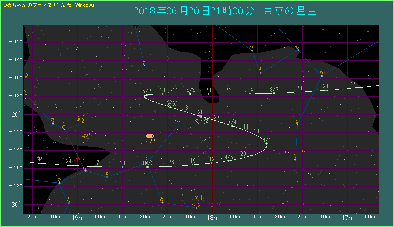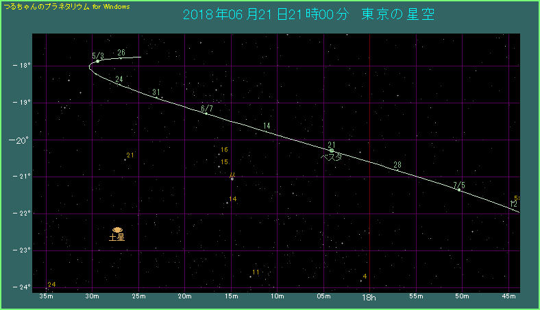 ベスタはいて座の一部、南斗六星の先に位置するμ星の近くにあります。小惑星は惑星の仲間ですから、恒星に対する位置が日々変わります。ベスタの移動経路を示しておきましたので、参考にしてください。