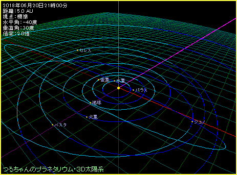 衝とは惑星などの天体が、太陽から180度離れた位置へやってくることです。太陽系の軌道図を見ると、地球から見たベスタは太陽とちょうど反対方向にあり、衝であることがわかります。