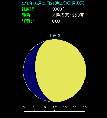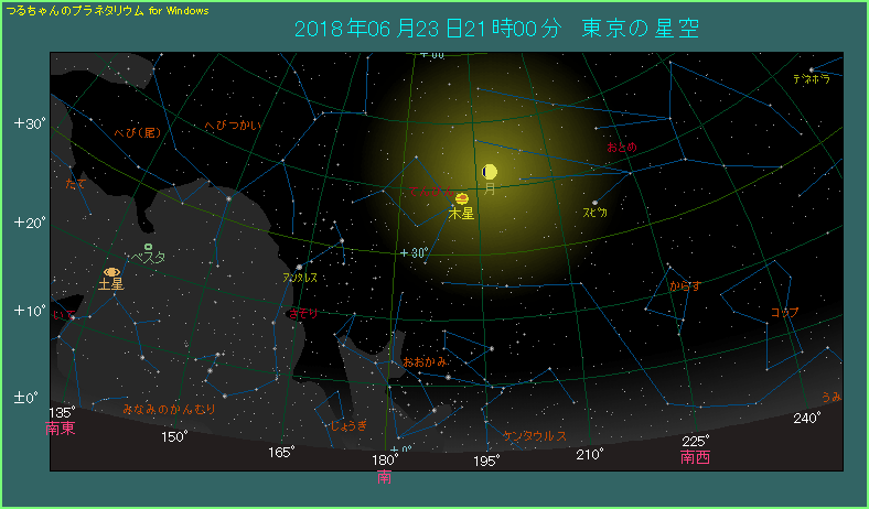 前日23日の21時としました。月齢は9.7で、月は丸みを帯びています。その左下へ5.9度離れた位置に木星があります。