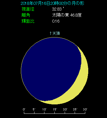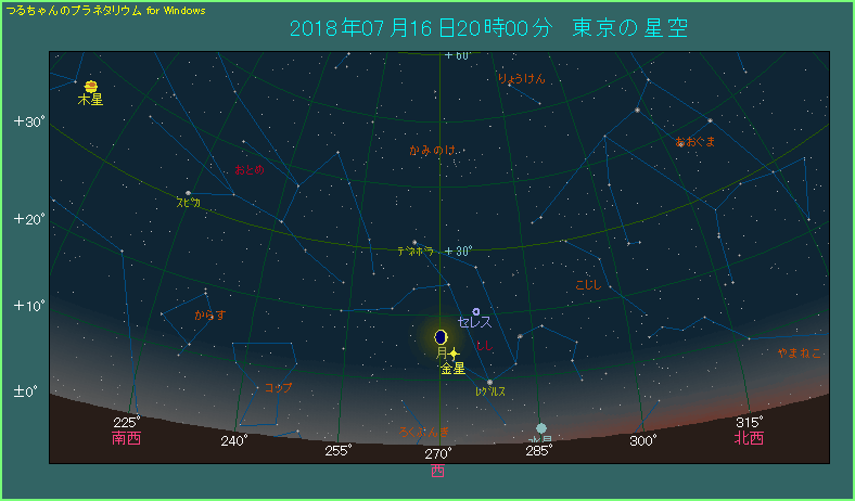 7月16日は月と金星がななめに並びます。 下の星図は東京で20時ごろ、西の空を眺めたようすです。月齢3.3の三日月の右下に、-4等級で輝く金星がななめに並んでいます。間隔は3.2度と比較的良い条件です。