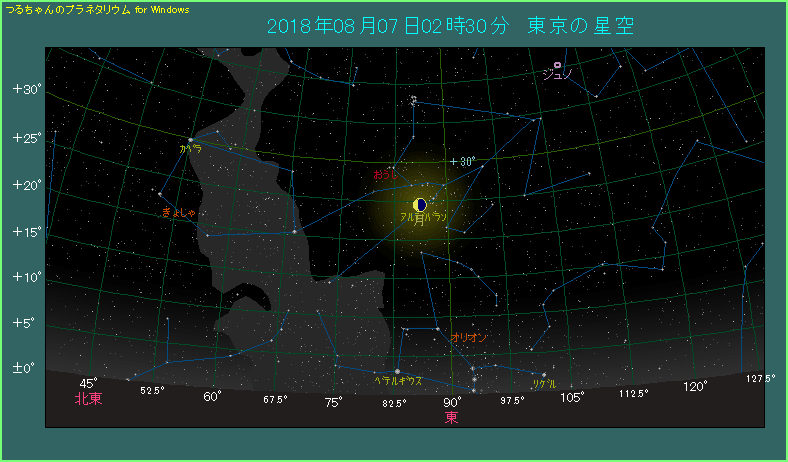 昨年あたりは月がアルデバランを隠すアルデバラン食が見られました。しかし、食となるシーズンを過ぎてしまい、最近は接近が見られるに留まります。この日の月齢は24.6で、三日月よりも少し太い目です。アルデバランはその下側にあり、東京で2時半ごろの場合だと、28分角まで近づいています。