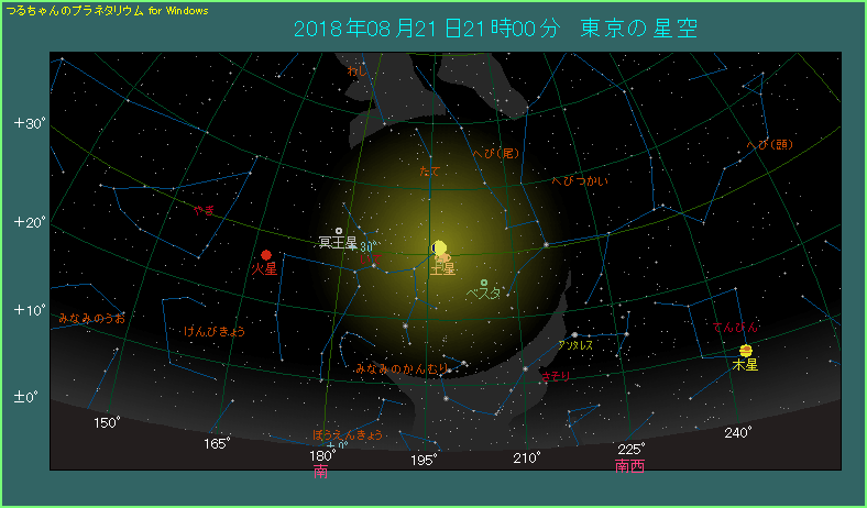 8月21日の夜、月が土星に接近します。 下の星図は21時ごろ、東京から南の方角を眺めたようすです。まず目にとまるのは月齢10.1の月です。土星はその右下1.6度のところにあり、接近条件としては良いものです。