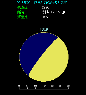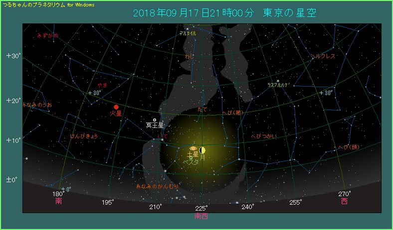 9月17日の夜、月と土星が接近して横に並びます。 下の星図は東京で21時ごろ、南西方向を眺めたようすです。上弦を半日だけ過ぎた半月があります。土星は月から3.1度離れたところで、左側に並んで見えます。土星は0.4等と明るいですから、すぐにわかるでしょう。