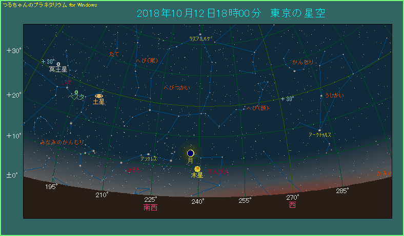 18時ごろ、南西の低い位置をご覧ください。月齢3.2の三日月が見えます。その右下へ5.6度離れたところに木星があります。空が完全に暗くなるのは東京で18時35分ですから、まだ少し薄明が残った状態です。