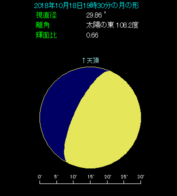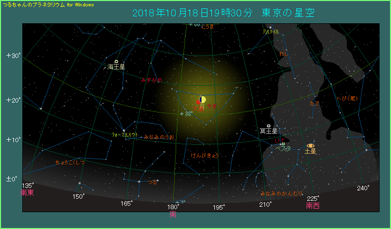 19時半ごろ、南の空をご覧ください。月齢9.3の丸みを帯びた月が目に入ります。火星はすぐ左下で、間隔は1.6度しかありません。先々月が6.2度、先月は5.0度だったことを考えると、今月は条件の良さが際立ちます。
