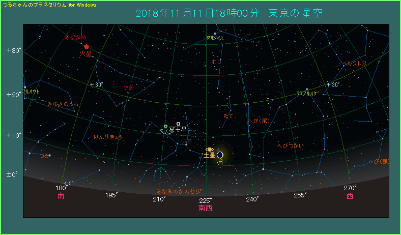 下の星図は南西方向のようすです。土星が太陽に近づいてきたため、今月は18時という早い時間帯です。それでも土星の高度は15.5度しかありません。今日は月齢3.7で三日月です。土星は三日月の左側です。両天体の間隔は4.0度と、まずまずの条件です。