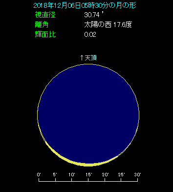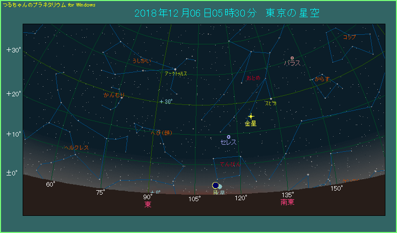 東京では日の出まであと1時間6分ありますが、高度が上がって見やすくなるのと、空が明るくなるのとの競争です。ちょうど良い頃合いを見計らってご覧ください。双眼鏡をお持ちの方はお忘れなく。