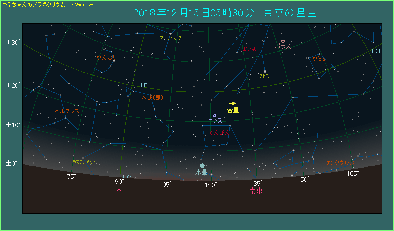 下の星図は朝の5時半ごろ、東南東の低空を眺めたものです。東京では5時11分から薄明が始まっており、空が白み始めています。また、6時43分の日の出まで1時間13分ありますが、この後空はどんどんと明るくなっていきます。