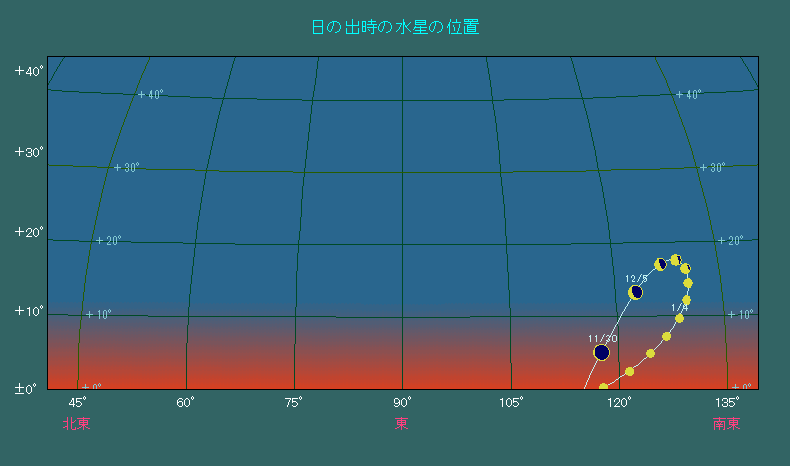 水星の高度は5.2度、明るさは-0.4等です。この時間帯なら、肉眼でもポツンと光る水星を見つけられるでしょう。視力に自信がない方は、双眼鏡を使えば簡単です。