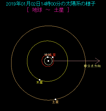 1月2日に土星が合となります。 合とは地球から見た惑星が、太陽と同じ方向にやってくることです。下に示した太陽系の図を見ると、地球、太陽、土星の順に一直線に並んでおり、合であることがわかります。土星は太陽と同じ方向に見えますので、太陽の強烈な光に邪魔されて観測することができません。