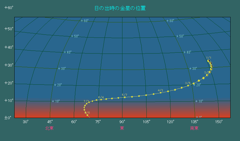日の出時刻における金星の位置変化の図を見ると、既に高度が下がり始めています。そしてこの後も、下がる一方です。3月からは20度を切ってきて、人目に付きにくくなってきます。