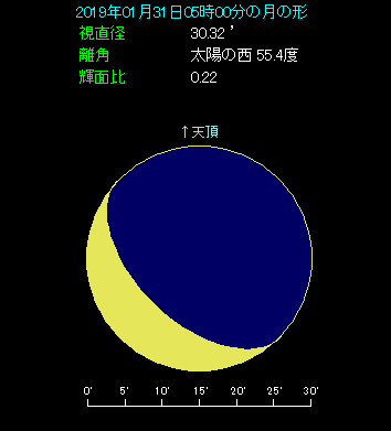 今月の3日に続いて、1月31日も月と木星が接近します。 朝の5時ごろ、南東のやや低い位置を見てみましょう。5日後が新月という太った三日月があります。そのすぐ下側に-1.9等で明るく光る木星があります。両天体の間隔は2.8度と狭く、今月3日に見られたものよりも条件の良い接近です。