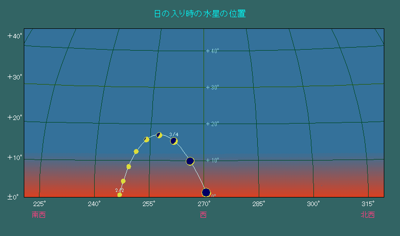日の入り時刻における水星の位置変化 |
