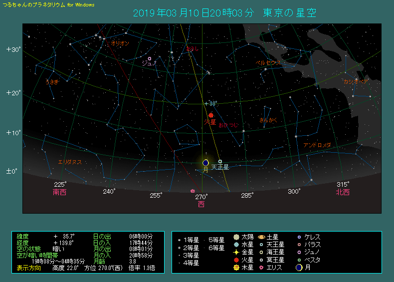 ところで、月は太陽の光を受けて光ります。太陽は黄色の線(天の黄道)の延長上にありますので、月が光る方向は、概ね天の黄道の傾きの方向になります。三日月が光る方向が違うのも、なんとなく納得できるでしょう。