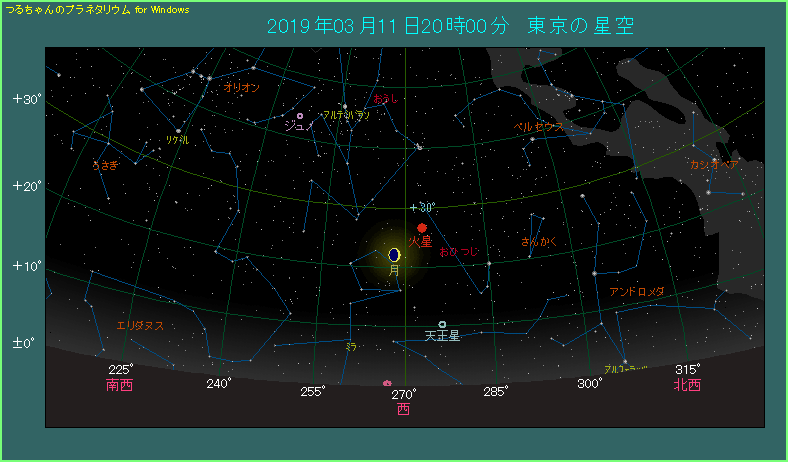3月12日は月と火星が近づきます。 下の星図は3月11日の20時ごろ、東京から見た西空のようすです。三日月よりも少し太った月齢4.8の月が見えます。火星はその右上、6.0度離れたところにあります。間隔が開いている上に、明るさも1.3等で、火星としてはさえません。