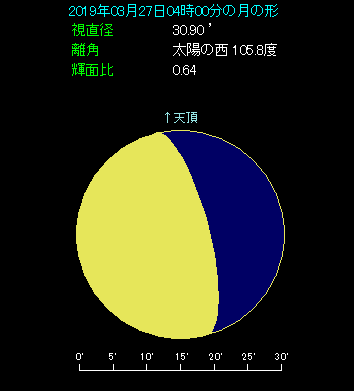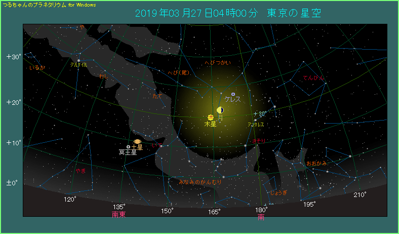 3月27日は月と木星が並びます。 朝の4時ごろ、南の空をご覧ください。下弦前日という、やや丸みを帯びた月が見えます。-2.3等の木星は月の左下です。間隔は4.0度と決して狭くはありませんが、まずまずの条件です。