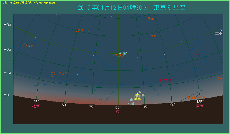 下の星図は朝の4時半ごろ、東京から東方向を見たものです。低い位置に明るい金星がすぐ目にとまります。水星は金星から左下へ4.8度離れたところにあります。高度は2.9度しかありませんし、明るさも0.4等です。日の出を43分後に控えたこの時間帯に見るためには、決して十分な明るさとは言えません。