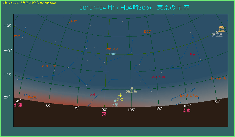 4月17日の早朝、水星と金星が斜めに並びます。 下の星図は東京から朝の4時30分に、東方向を眺めたようすです。地平線に近い所に明るい金星が見えます。水星は金星の左斜め下、4.3度離れた所にあります。高度は金星が6.7度、水星は3.7度しかありません。