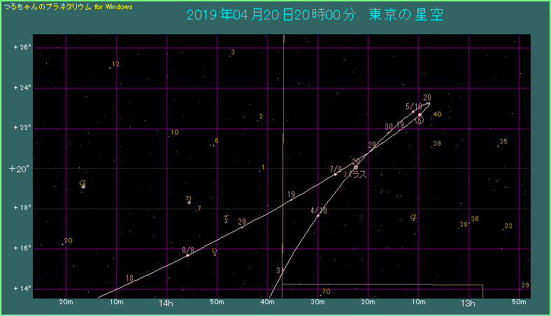 パラスは今、うしかい座との境界に近い、かみのけ座にあります。上に赤道座標系による拡大図も載せておきました。左端にあるα星は、うしかい座のアークトゥルスです。そこからη星(2.4等)をたどり、パラスに近づいてください。
