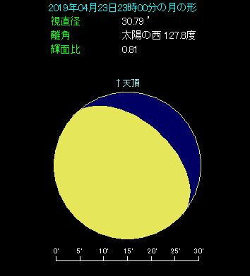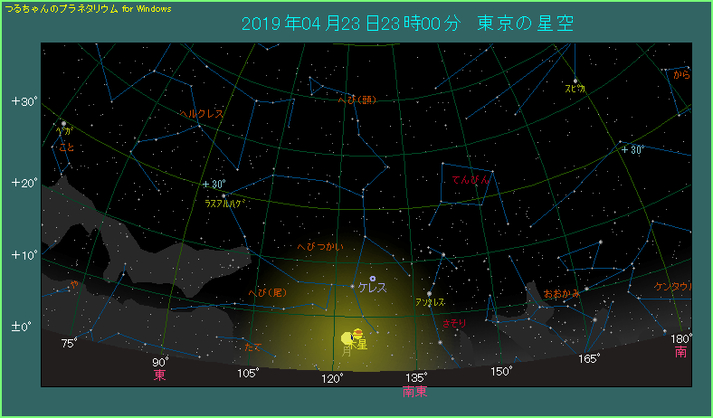4月23日の遅い時間、月と木星が接近します。 最も近づくのは東京で19時台です。しかしこの時は、地平線下で見ることができません。下の星図は23時ごろ、東京から南東方向を眺めたようすです。地平線近くに月が昇ってきたところです。満月から4日が過ぎた丸みを帯びた月です。その右隣へ2.1度離れ、-2.5等の木星があります。