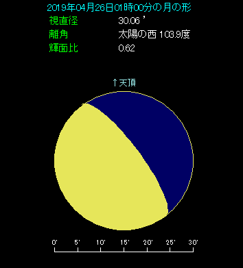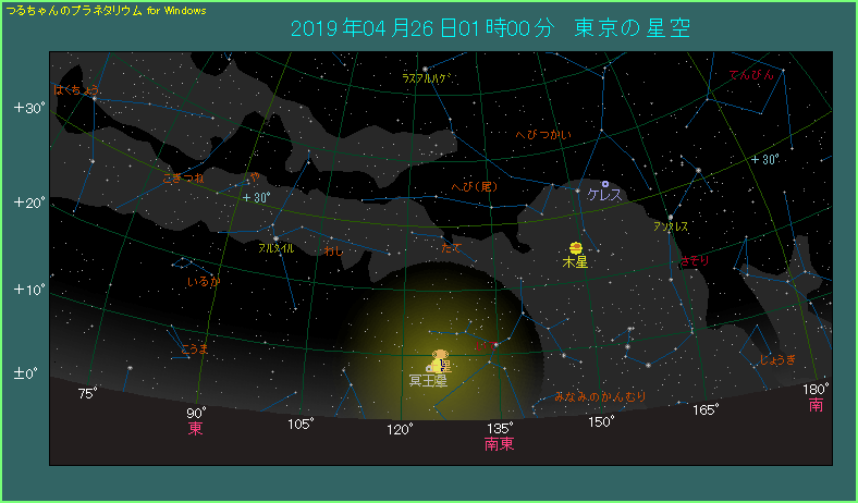 4月26日に日付が変わってから、月と土星の接近が見られます。 東京で最も接近するのは25日の22時頃ですが、地平線の下で見ることができません。実際に見られるのは月と土星が昇ってからで、星図では26日の1時としています。月齢は20.3で、翌日が下弦です。土星は月の上側にあり、間隔が1.7度と比較的狭くなっています。