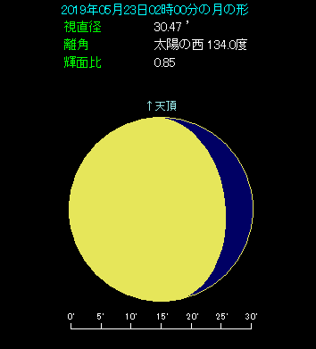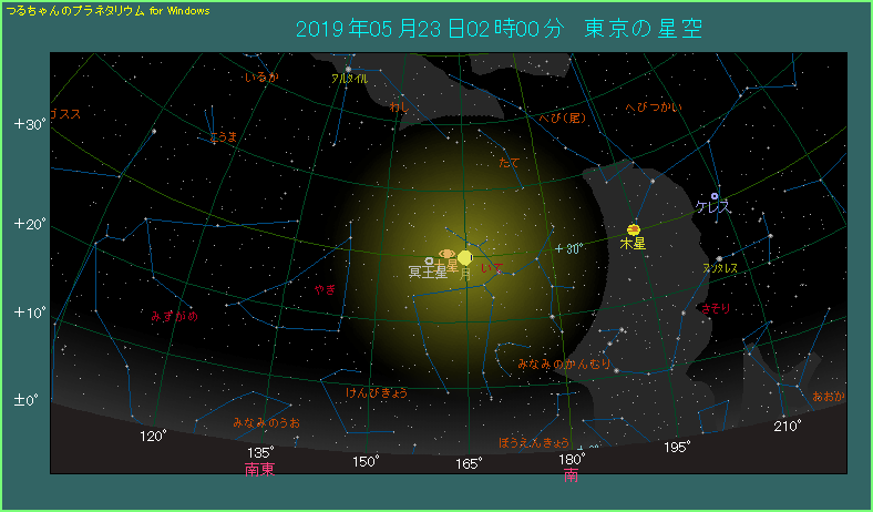 5月23日未明、月と土星が接近します。 南南東の空を23日2時頃にご覧になると、月と土星が横に並んでいます。月齢は17.8で丸みを帯びた月で、土星は左側へ2.9度離れています。