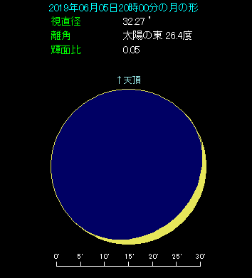 この日、東京の日の入り時刻は18時53分で、空が完全に暗くなるのは20時40分です。星図にある20時ごろは、空がまだ少し明るい状態です。火星の高度は10度あまりと低い位置にあります。月にいたっては7度しかありません。おまけに火星の光度は1.8等まで落ちていますし、月齢2.0という細い月ですから、両方相当見づらいでしょう。